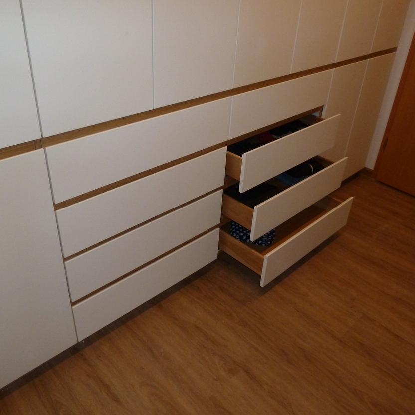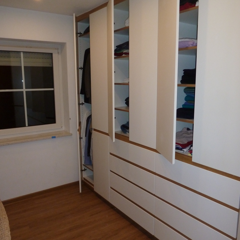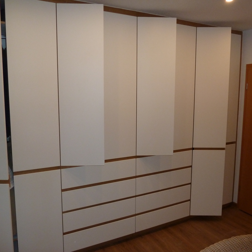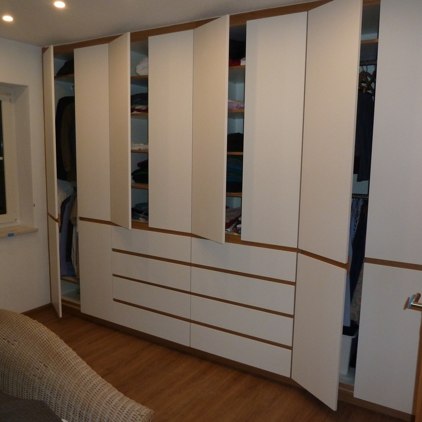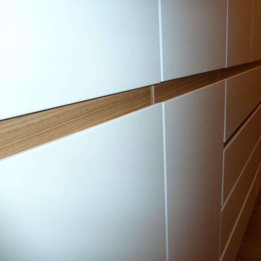 Ein großer, weißer Einbauschrank mit holzfarbenen Akzenten, der nahtlos in die Wand eines gemütlichen Wohnzimmers integriert ist.