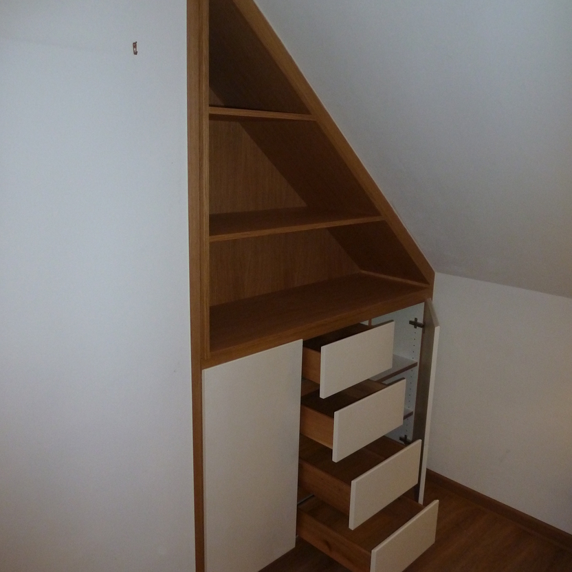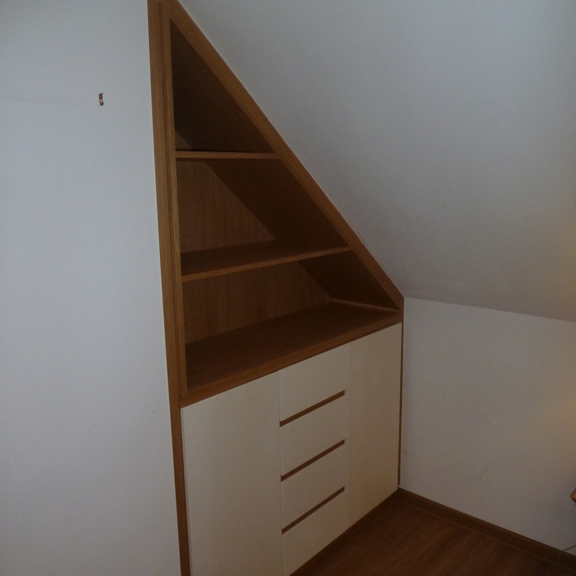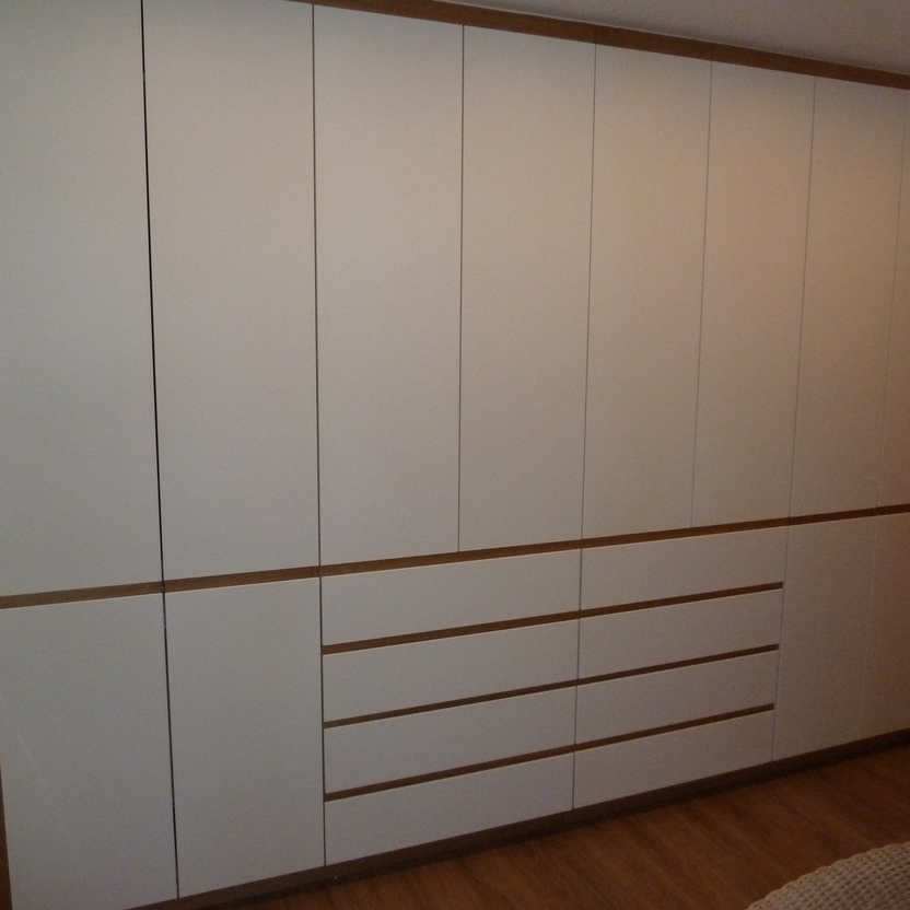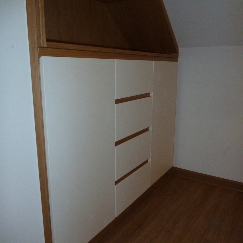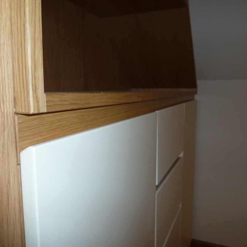 Ein großer, weißer Einbauschrank mit holzfarbenen Akzenten, der nahtlos in die Wand eines gemütlichen Wohnzimmers integriert ist.