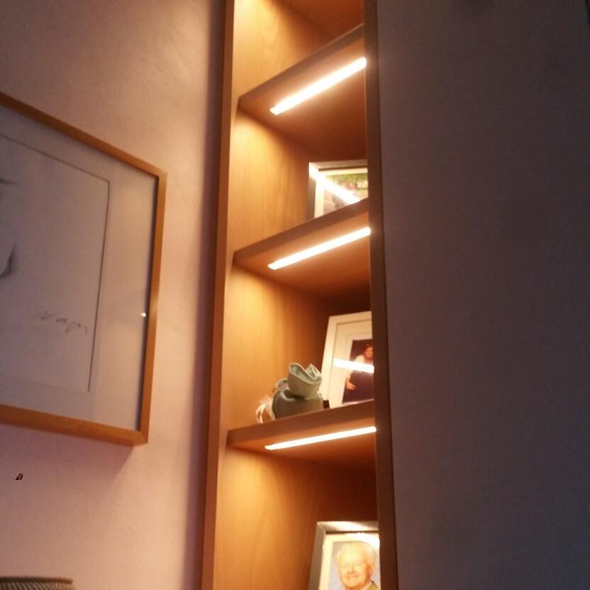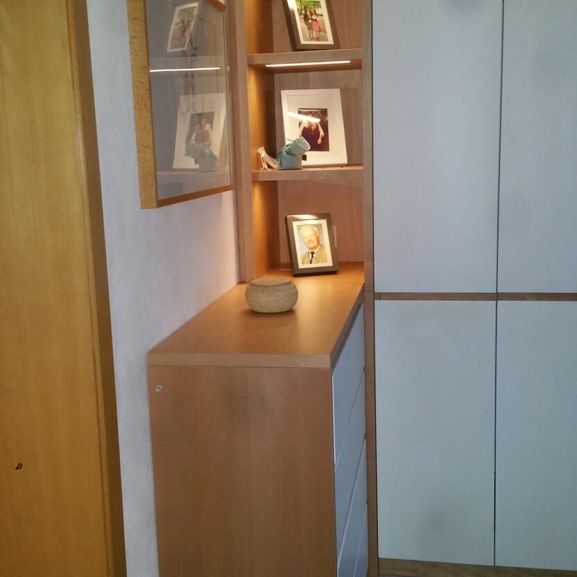 Ein Flur mit maßgefertigten Möbeln, beleuchteten Regalen und einer Kommode, ergänzt durch Kunst und einen orientalischen Teppich.