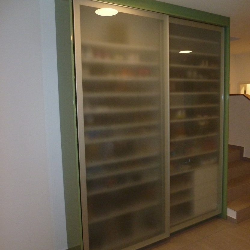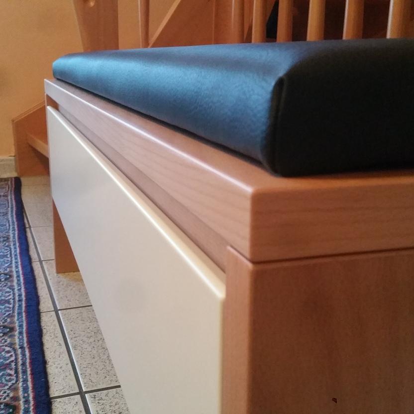 Helle Flurmöbel nach Maß mit Spiegel und eingebautem Schuhschrank neben einer Treppe, die in ein offenes Wohnkonzept führt.