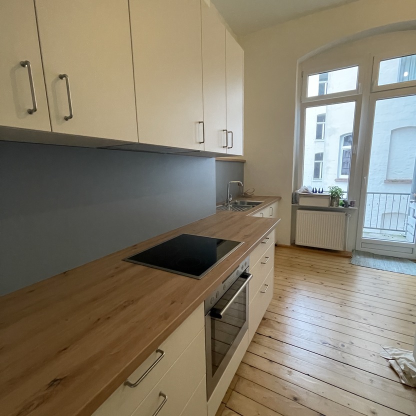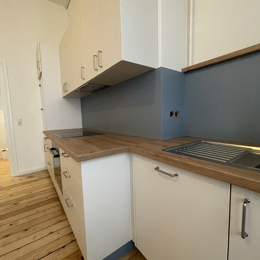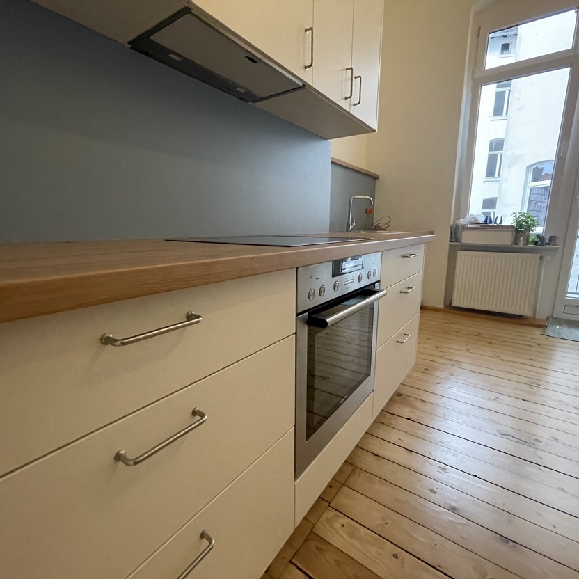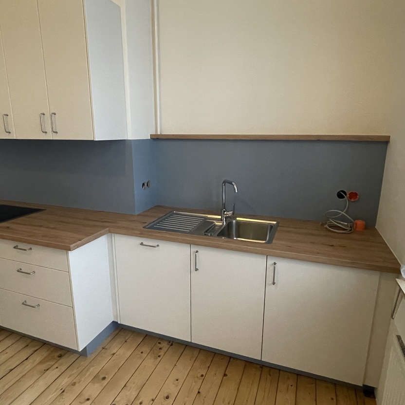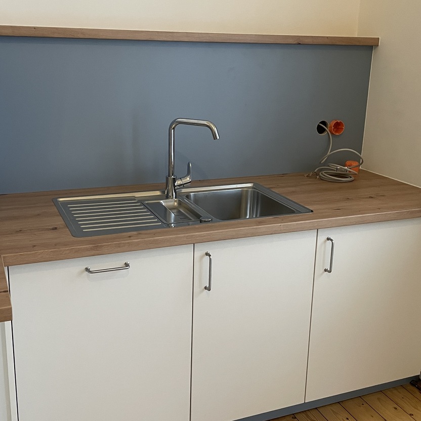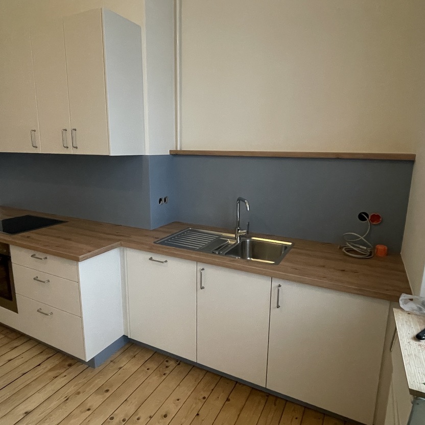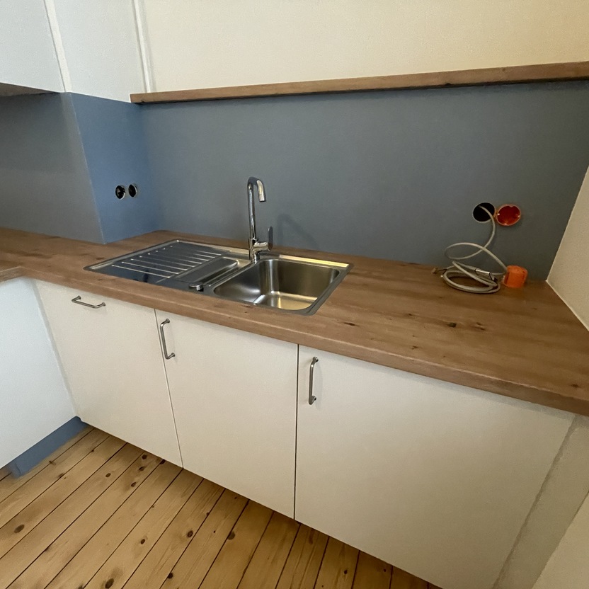 In Montage befindliche Küche nach Maß mit hellen Fronten, Holzarbeitsplatte und Einbauspüle auf einem rustikalen Holzboden.