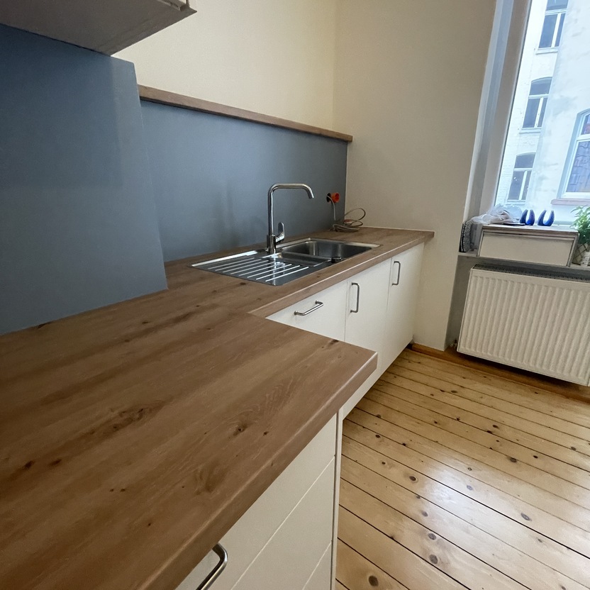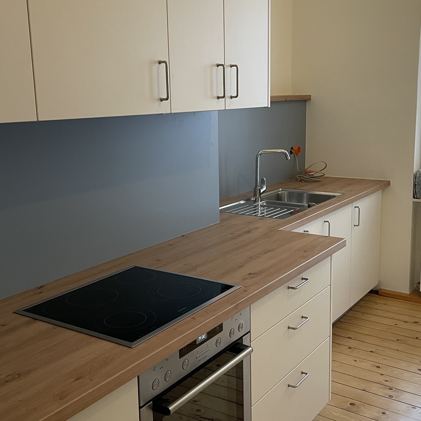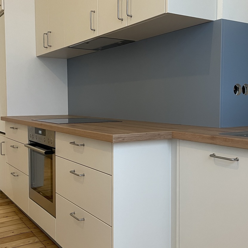 Küche HPL weiß mit Arbeitsplatte in Eiche Optik